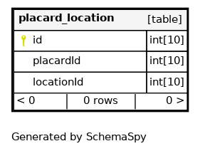 | placardLocation | Must be unique | Asc/Asc | placardId + locationId |